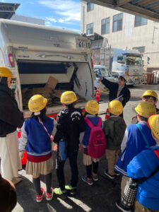 リサイクルの流れに関しての説明、塵芥車(パッカー車)での回収体験、実物のベール品に触れる、リサイクルの妨げになってしまう紙(禁忌品)の説明等をさせてもらいました。